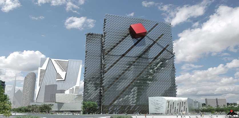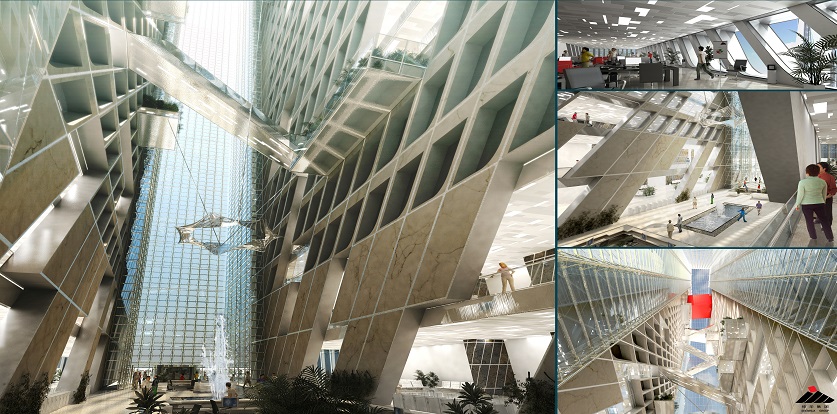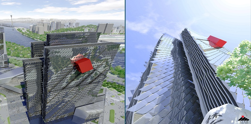 設(shè)計(jì)手法:配合該區(qū)域經(jīng)濟(jì)發(fā)展情況,在短期內(nèi)還需要建設(shè)高質(zhì)量的建筑物。成為城市性標(biāo)志建筑。新總部形象需與自然融為一體,并與周圍的自然元素銜接,且在某種情況下可形成一面“鏡子”,通過一種特殊形式反射出這些形象:反射出天空的藍(lán),反射出公園的綠、反射出海水的藍(lán)。設(shè)計(jì)了波浪狀的垂直立面,是考慮波動(dòng)的立面可反射出更加逼真的形象。同時(shí)對(duì)總部辦公樓進(jìn)行體量調(diào)整:整體形象為四個(gè)垂直棱柱,分別象征著神華集團(tuán)里四所不同行業(yè)的公司。此設(shè)計(jì)理念主要基于神華集團(tuán)的組織結(jié)構(gòu)分布,外立面上醒目的集團(tuán)標(biāo)識(shí)也再次闡述了建筑的寓意。紅色的棱形柱,橫架于四個(gè)建筑物中,象征著燃燒的煤炭。該設(shè)計(jì)手法加強(qiáng)了對(duì)標(biāo)志概念性的解讀。對(duì)于酒店,設(shè)計(jì)過程中不引入象征性元素。是基于其本身別具匠心的形象,該形象符合商業(yè)廣告的標(biāo)準(zhǔn),設(shè)計(jì)過程引入了宏觀穿孔材料,以打造高水準(zhǔn)客房。特殊的宏觀穿孔材料可“適應(yīng)”窗口角度,不斷調(diào)整以指向天空,產(chǎn)生出兩種不同形象的效果,一種是為順應(yīng)商業(yè)的標(biāo)準(zhǔn),而另外一種則體現(xiàn)出其自然屬性。兩座塔樓,一座是總部辦公和及其基礎(chǔ)設(shè)施用房,另外一座是酒店,位于同一群樓的二者功能分布其中,視覺上又形成整體效果,打造出一個(gè)綜合體。會(huì)議中心設(shè)置在群樓上方,該設(shè)計(jì)理念則是源于一種自然設(shè)計(jì)的手法。總部的塔樓和酒店均為南北朝向,并合理地運(yùn)用錯(cuò)層式設(shè)計(jì),使其坐看珠江和澳門海灣美景。