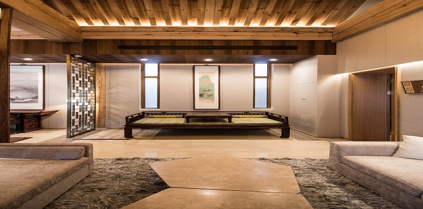 項(xiàng)目結(jié)合了中西方傳統(tǒng)和現(xiàn)代藝術(shù)。起居室的靈感源于幽靜的山脈,既有中式家具的運(yùn)用,又不乏現(xiàn)代感。